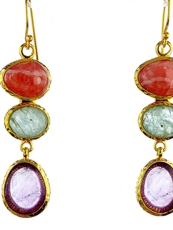 סט עגילים מצופה זהב 14K עם אבני חן טבעיות אמטיסט, רודוכרוסייט ואקווה מרין. מעוצב ומיוצר במיומנות בארץ ישראל. זוג עגילים מעוצבים מדהים שיהווה מתנה נהדרת ליום הולדת, סיום לימודים, אירוסין, יום נישואין, חג או כל אירוע מיוחד אחר. זמין בכסף 925 ועם סט תליון. אורך 4 ס"מ