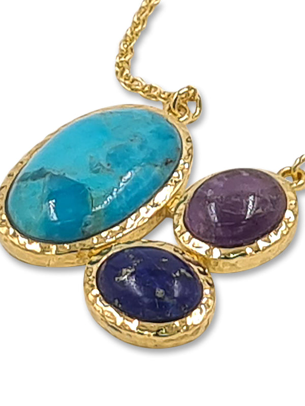תליון מצופה זהב 14K עם אבנים אמיתיות אמטיסט, רודוכרוזיט ואקוומרין. כל כך קלאסי שהוא מתאים לכל אירוע, והוא עשוי ביד באומנות. מתנה מיוחדת שהיא בטוח תאיר את החיוך של אהובכם. זמין בתליון כסף 925.